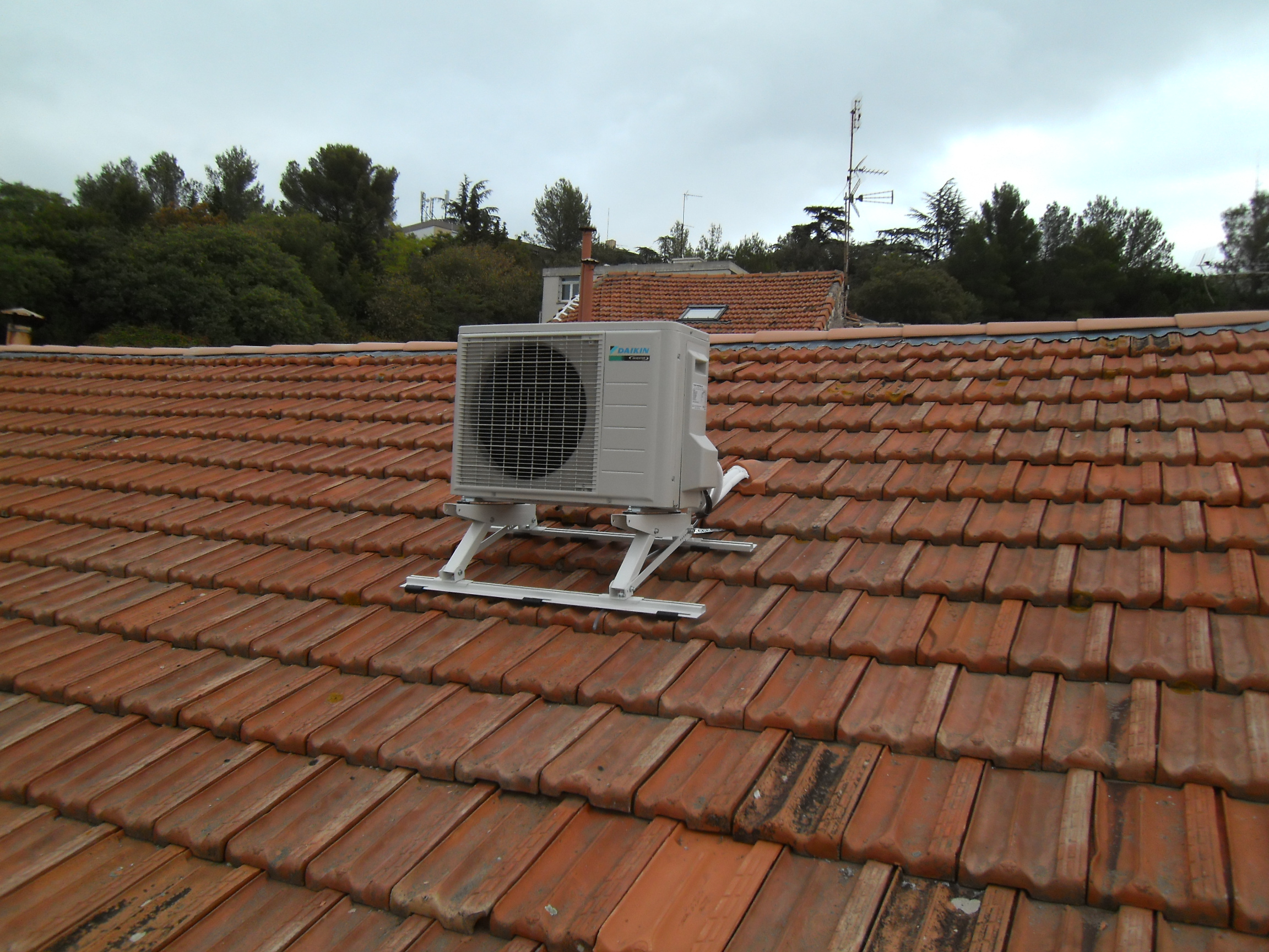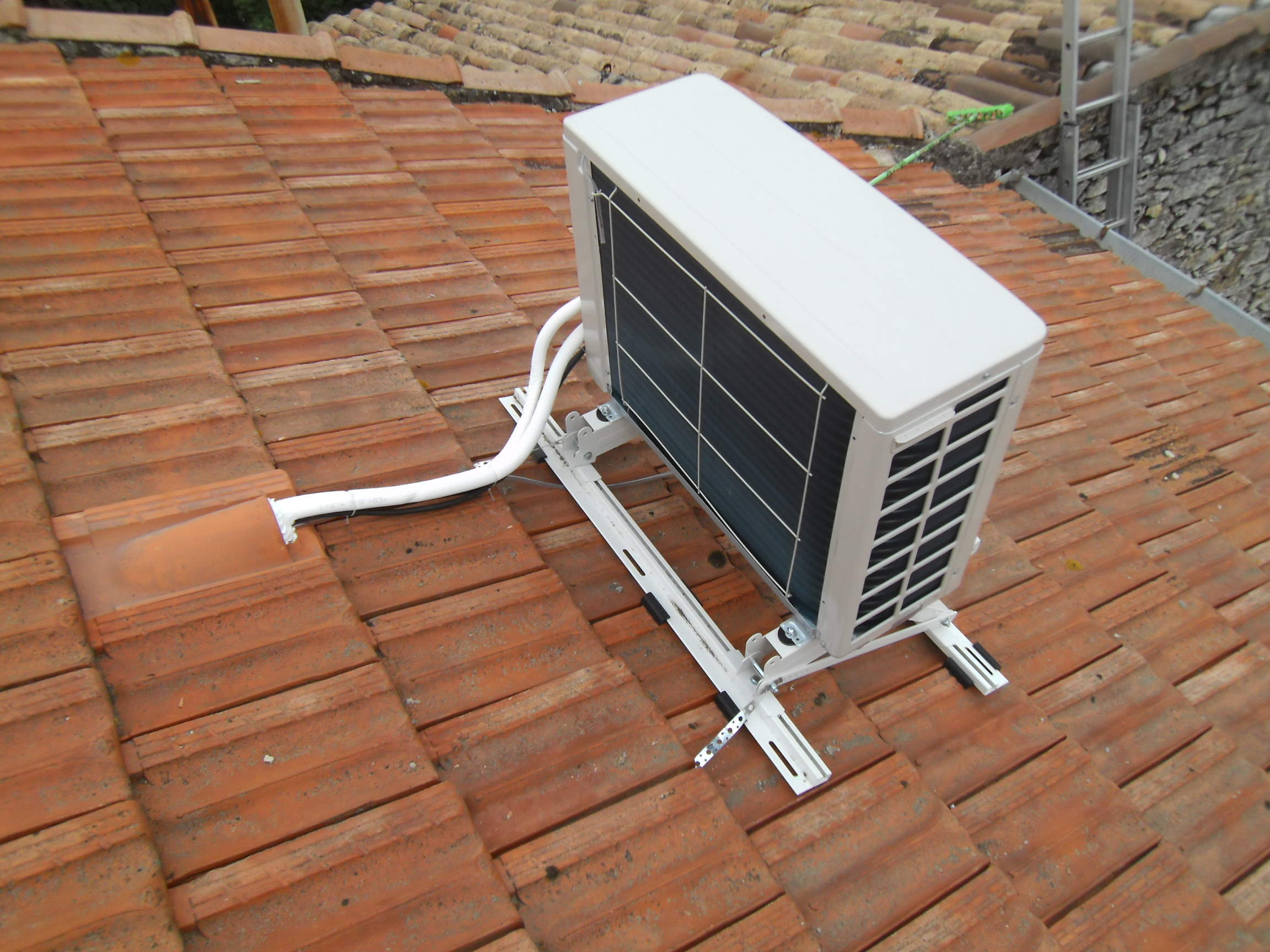 Il a été nécessaire de poser une tuile chatière afin de sortir les liaisons frigorifiques sur le toit en maintenant l’étanchéité de la toiture et de poser le support de groupe maintenu par des bandes galvanisées allant se fixer sur les chevrons .