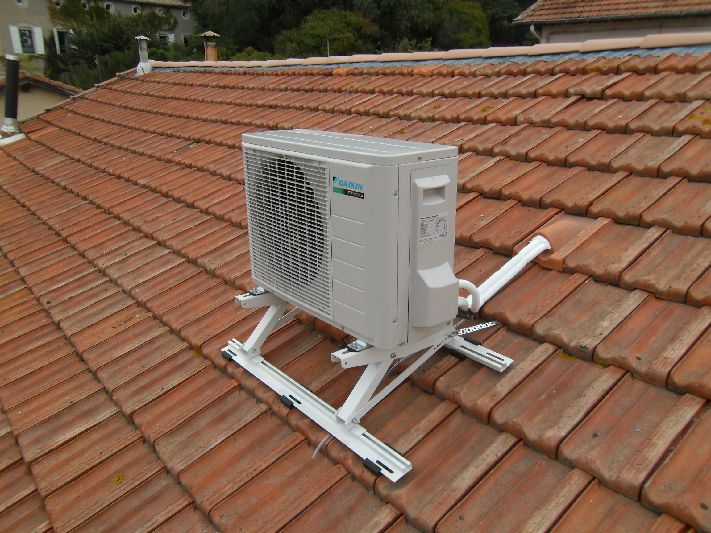 Il a été nécessaire de poser une tuile chatière afin de sortir les liaisons frigorifiques sur le toit en maintenant l’étanchéité de la toiture et de poser le support de groupe maintenu par des bandes galvanisées allant se fixer sur les chevrons .